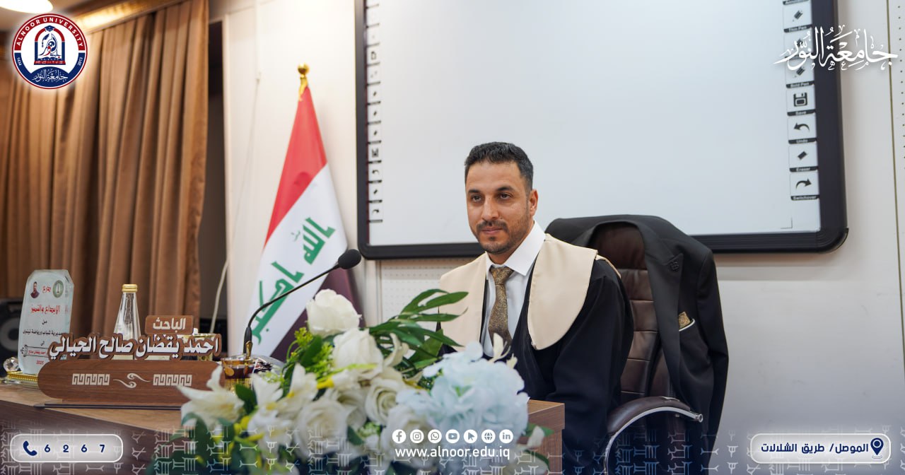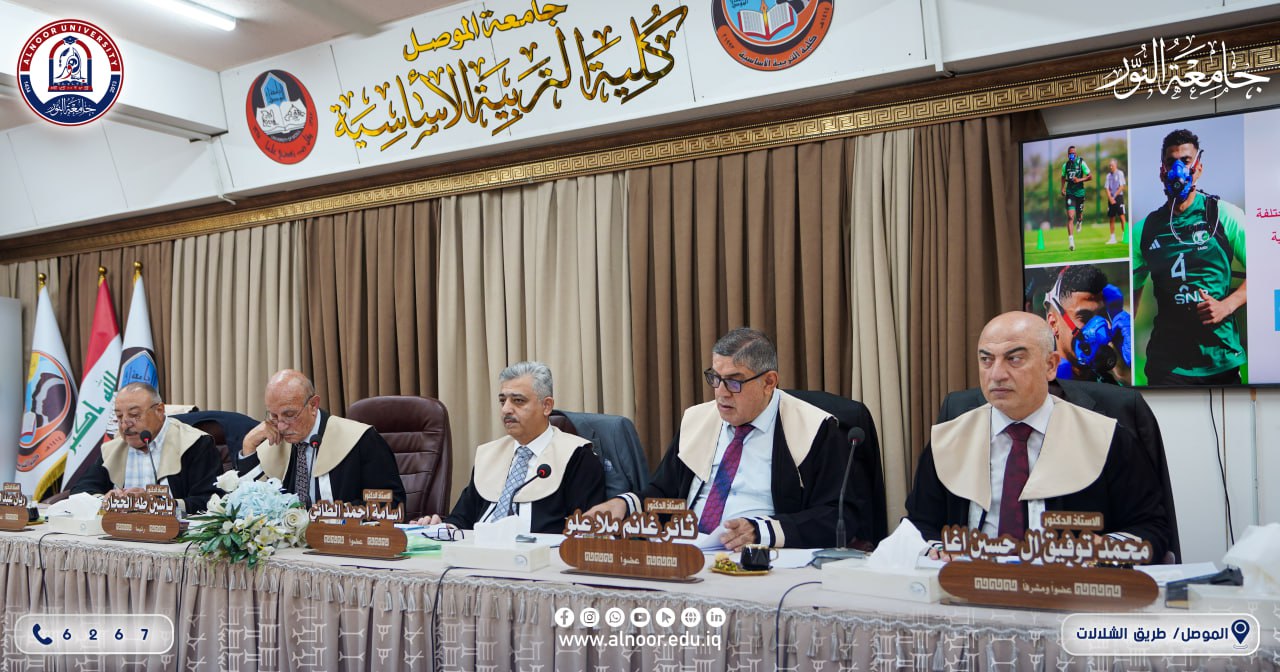 تحرص المؤسسات الاكاديمية العراقية على اعتماد الاسرة العلمية لجامعة النور في لجانها العلمية الكبيرة وفي هذا المجال ترأس الاستاذ الدكتور ياسين طه الحجار رئيس جامعة النور صباح يوم الخميس الموافق 2025/7/31 لجنة مناقشة الطالب أحمد يقضان صالح عن اطروحته التي تقدم بها الى قسم التربية البدنية وعلوم الرياضة في كلية التربية الأساسية في جامعة الموصل تحت عنوان(دراسة ميدانية لحساب الطاقة المصروفة لمسافات مختلفة من الأركاض بدلالة عدد من المؤشرات الفسيولوجية) بإشراف الاستاذ الدكتور محمد توفيق حسين آل أغا.