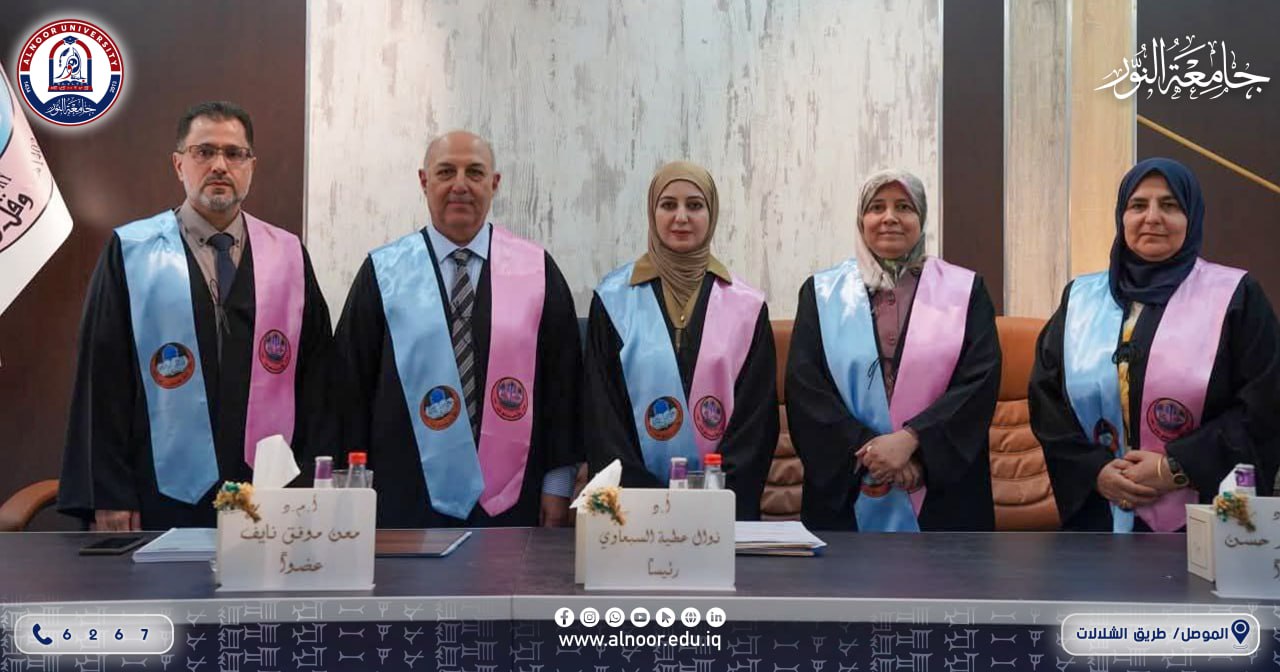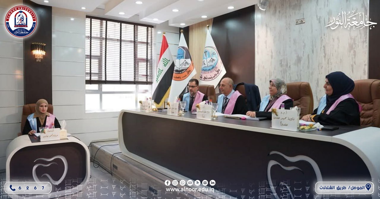 تدريسي من جامعة النور يشارك في مناقشة رسالة ماجستير عن تأثير السدادات اللبية على الخلايا الحيوية.