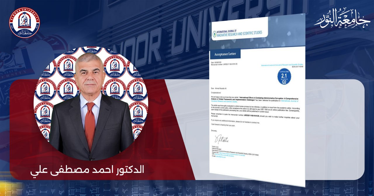 تم قبول نشر بحث جديد للأستاذ المساعد الدكتور أحمد مصطفى عميد كلية القانون في جامعة النور في مجلة