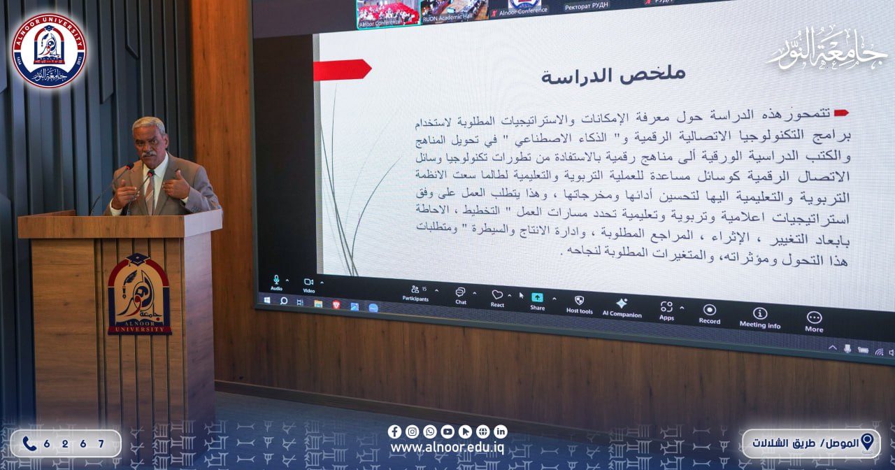 في اليوم الاول للمؤتمر العلمي العالمي للاعلام المشترك بين جامعتي النور والموصل ..وهو يوم الاربعاء الموافق 2025/9/10 القيت في جلسة البحوث الافتتاحية اربعة بحوث هي ( أثر التحولات التكنولوجية للذكاء الاصطناعي والواقع الافتراضي على الاعلام العسكري )وهو بحث مشترك بين الاستاذة الدكتورة لبنى خميس مهدي المديرة العامة لدائرة البحث والتطوير في وزارة التعليم العالي،والاستاذة الدكتورة عذراء اسماعيل زيدان رئيسة قسم بناء وتمكين القدران في جامعة بغداد. و(رحلة في الاعلام والصحافة من الدراسة الجامعية الى البحث لنيل الدكتوراة) للدكتورة بيلا بيلاغروفا من روسيا، و(تكنولوجيا الاتصال الرقمي والذكاء الاصطناعي في تعزيز وتطوير المهارات الادراكية للطفل) للدكتور عبد العزيز حميد علي التدريسي في جامعة النور،و(دور الاعلام في تشكيل الرأي العام واتخاذ القرار السياسي)للاستاذ الدكتور جاسم احمد خضير رئيس قسم الاعلام في كلية الاداب بجامعة الموصل