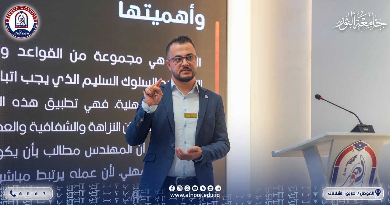 و قدم المدرس المساعد سعد صالح ذياب محاضرة تناولت أبرز السلوكيات المهنية الواجب اتباعها من قبل المهندسين، بالإضافة إلى تسليط الضوء على القوانين والأنظمة التي تنظّم مسؤوليات المهندس ودوره في المجتمع.