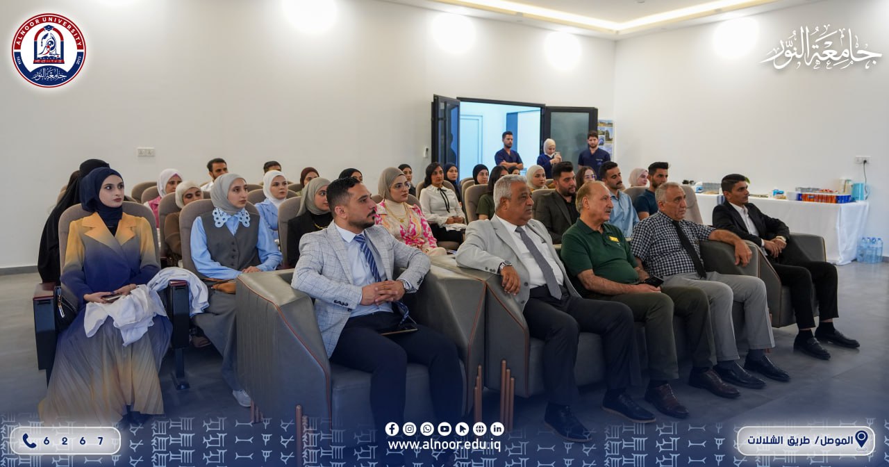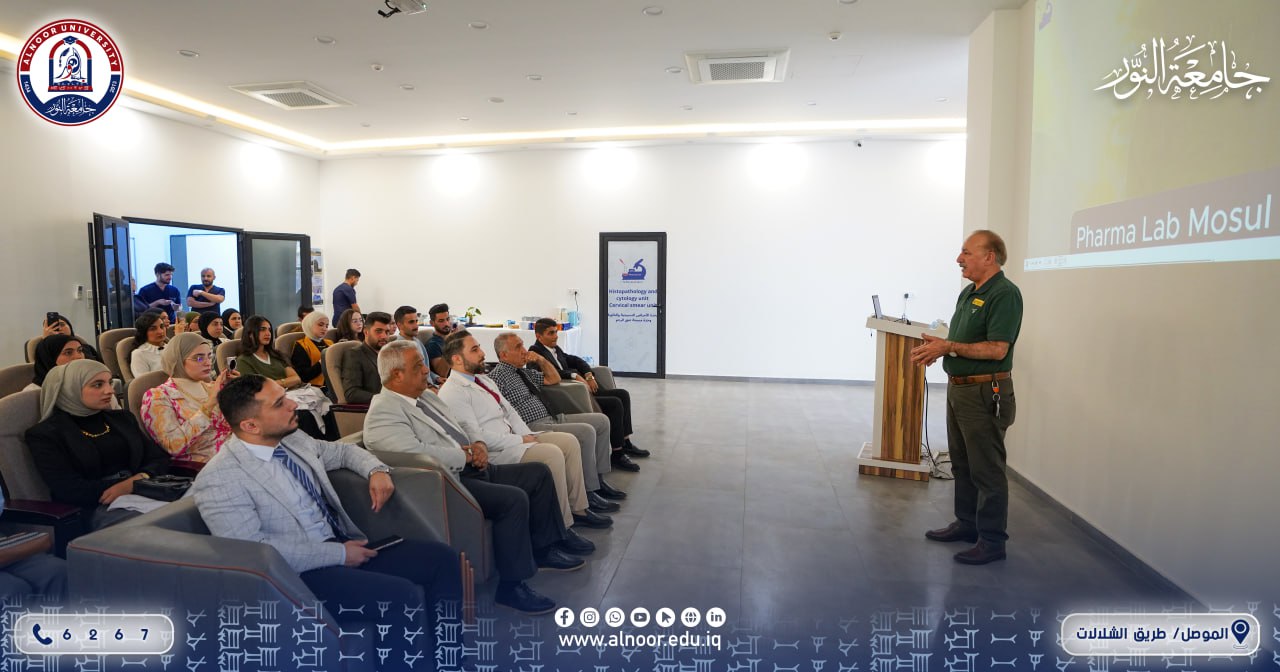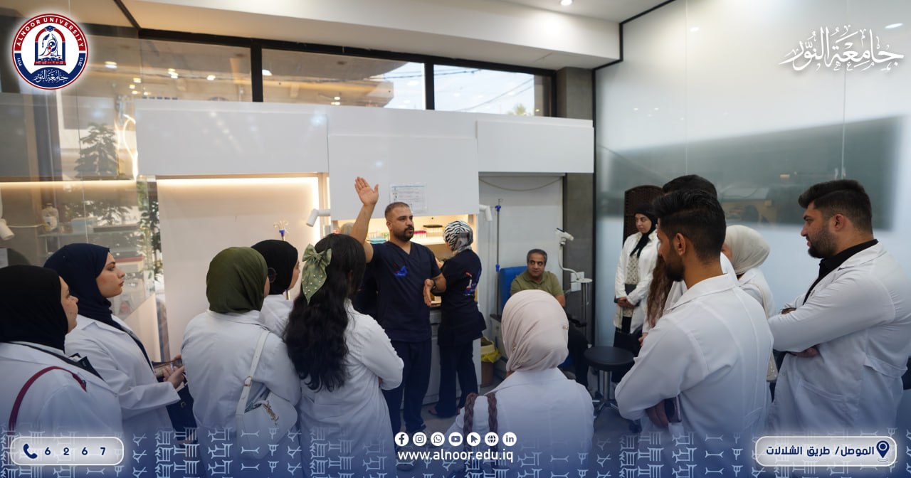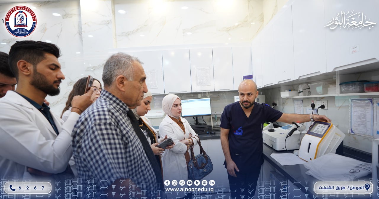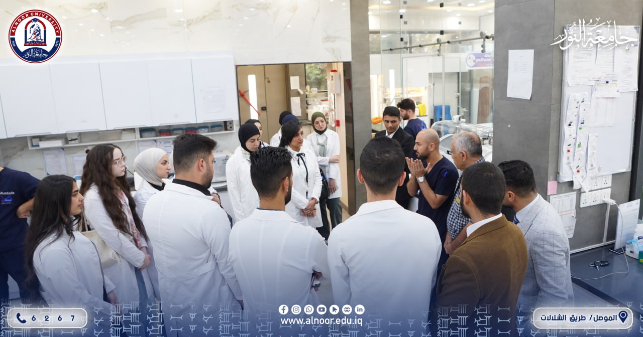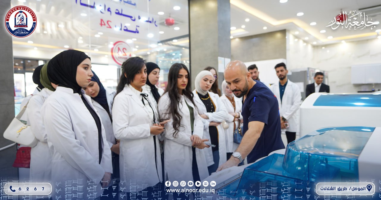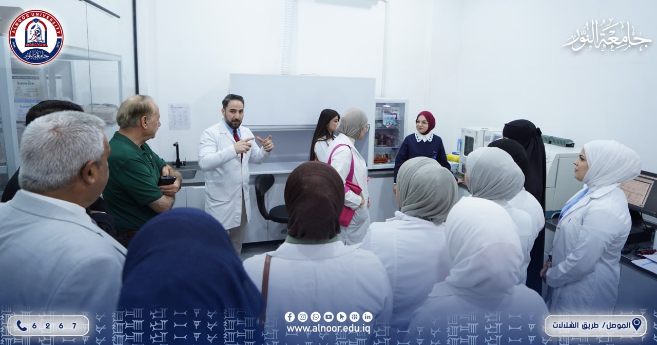 نظّم قسم تقنيات المختبرات الطبية في كلية التقنيات الصحية والطبية بجامعة النور صباح يوم الخميس الموافق 2025/11/6 زيارة تعريفية لطلبة المرحلة الرابعة إلى مختبر “فارما”، بحضور ومرافقة الأستاذ المساعد الدكتور هادي محمد احميد رئيس القسم، وبإشراف الأستاذ الدكتور إسماعيل إبراهيم داود سالم التدريسي في كلية طب الأسنان بالجامعة. رافَق الطلبة خلال الزيارة عددٌ من تدريسيي القسم، واطّلعوا على آلية العمل في المختبرات الحديثة وأساليب التحليل والتشخيص، بما يسهم في تعزيز الجانب العملي لطلبة القسم وربطهم بواقع العمل المخبري التطبيقي.