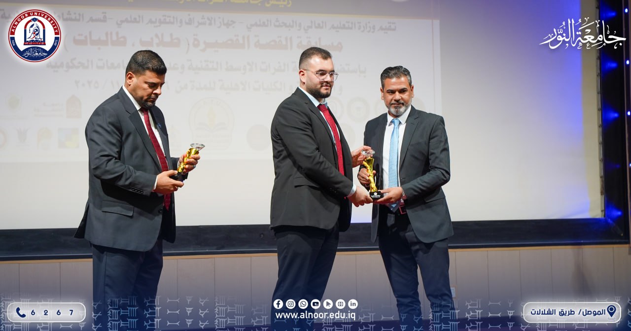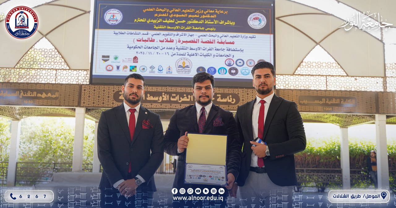 وجاء هذا التكريم في إطار مشاركة جامعة النور ضمن أكثر من 50 جامعة حكومية وأهلية شاركت في النسخة الافتتاحية للمسابقة، التي تهدف إلى تعزيز الإبداع الأدبي لدى الطلبة وتوسيع مساحة التبادل الثقافي بين الجامعات العراقية.