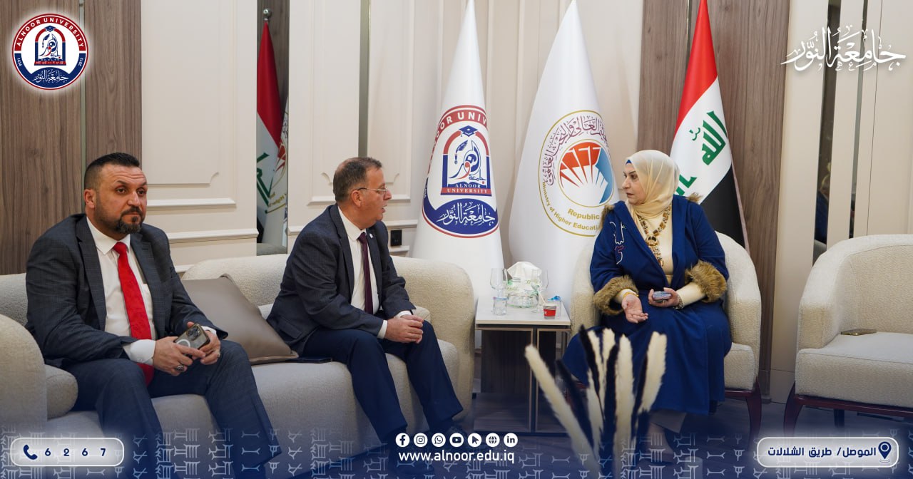استقبل قسم الترجمة في كلية الآداب بجامعة النور صباح يوم الثلاثاء الموافق 2025/12/2 وفدًا علميًا من قسم الترجمة بجامعة الموصل، في زيارة رسمية هدفت إلى تعزيز التعاون الأكاديمي وتبادل الخبرات بين الجانبين.