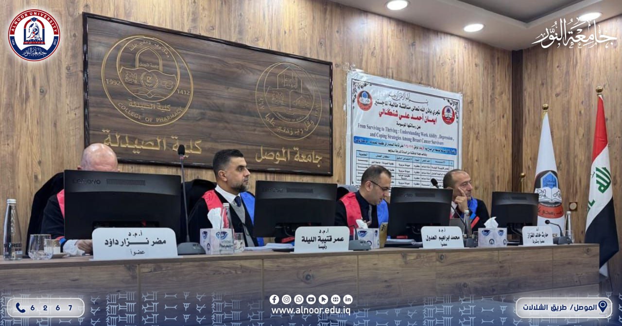 في اطار الحضور العلمي البارز لتدريسيي جامعة النور في الانشطة العلمية بما فيها من لجان مناقشة خاصة بالدراسات العليا فقد ترأس الاستاذ المساعد الدكتور عمر قتيبة بدر الدين الليلة عميد كلية الصيدلة في جامعة النور لجنة مناقشة طالبة الماجستير ايمان احمد علي شنگالي عن رسالتها التي تقدمت بها الى كلية الصيدلة بجامعة الموصل تحت عنوان