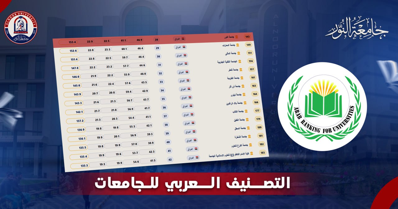 حققت جامعة النور تقدماً نوعياً ومؤشراً مهماً في التصنيفات العالمية والعربية والمحلية، ولا سيما في التصنيف العربي للجامعات للعام 2025، مؤكدةً حضورها الأكاديمي المتنامي ومكانتها بين الجامعات العراقية والعربية.