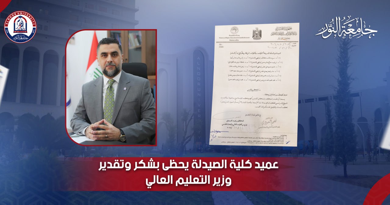 منح معالي وزير التعليم العالي والبحث العلمي الدكتور نعيم العبودي كتاب شكر وتقدير إلى عميد كلية الصيدلة في جامعة النور الأستاذ المساعد الدكتور عمر قتيبة بدر الدين، تقديرًا لجهوده العلمية والمهنية المتميزة.