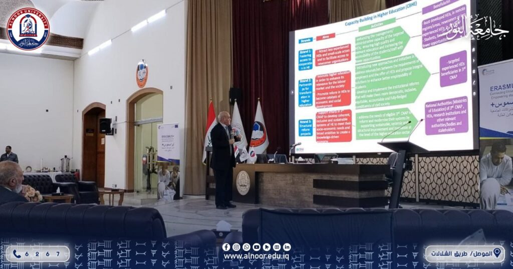 شاركت جامعة النور في ورشة عمل حول برامج منح الاتحاد الأوربي (Erasmus+) لتمويل المشاريع البحثية تحت عنوان “بناء القدرات في التعليم العالي”، نظمّتها دائرة البعثات والعلاقات الثقافية/ شعبة برامج ايراسموس في وزارة التعليم العالي والبحث العلمي، واستضافتها جامعة الموصل في المنتدى العلمي والأدبي.
