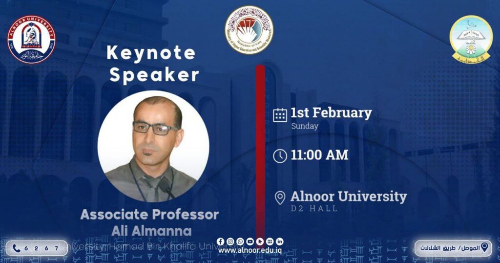 الأستاذ المشارك في اللسانيات والترجمة في جامعة حمد بن خليفة في قطر متحدثاً رئيسياً في افتتاح جلسات المؤتمر العلمي الدولي الرابع للغة الانكليزية الذي يعقد بالتعاون بين جامعتي النور والحمدانيةو تبدأ اعماله في يوم الاحد الموافق 2026/2/1..