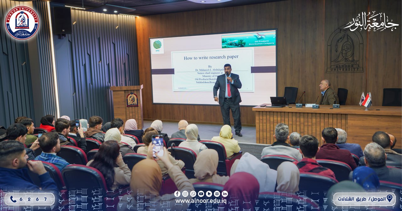 بإشراف وحضور الاستاذ الدكتور سعد الطعان عميد كلية الهندسة في جامعة النور نظّم قسم هندسة النفط صباح يوم السبت الموافق 14 شباط 2026 ورشة علمية متخصصة بعنوان أسلوب كتابة الورقة البحثية ومهاراتها،