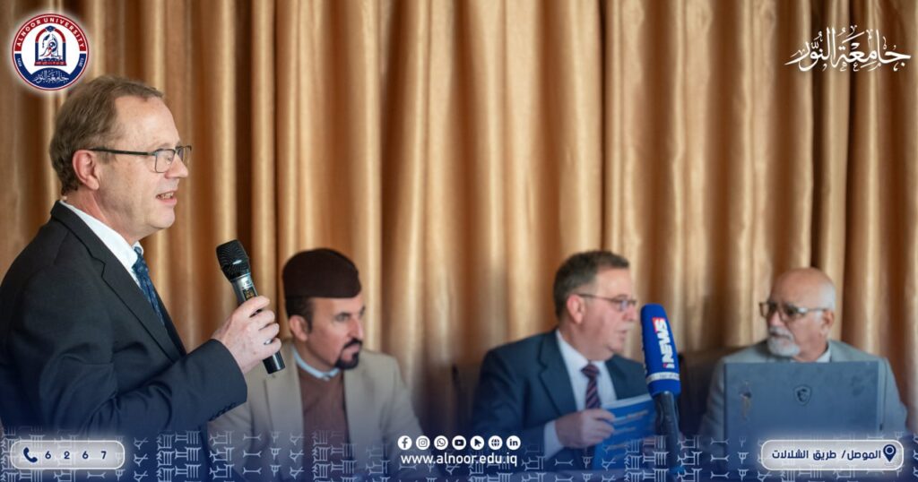 شهد مجمع الحوكمة الإلكترونية بمدينة الموصل احتفالية إطلاق وتوقيع كتاب “سيرة كاميرا: سرديات فوتوغرافية”، وسط حضور نُخبوي يتقدمه القنصل الفرنسي العام فابريس ديبلوشان ومجموعة من الأكاديميين والمثقفين. وقد برز خلال المحفل الدور المؤسسي المحوري لـ جامعة النور، بصفتها الجهة الداعمة والراعية لتنفيذ الكتاب وإخراجه بصيغته النهائية، حيث أسهم دعم الجامعة المباشر في إنجاز كافة الجوانب التنفيذية المتعلقة بإصداره، مما ضمن تقديم عمل متكامل يجمع بين الجودة الفنية واللغوية العالية.