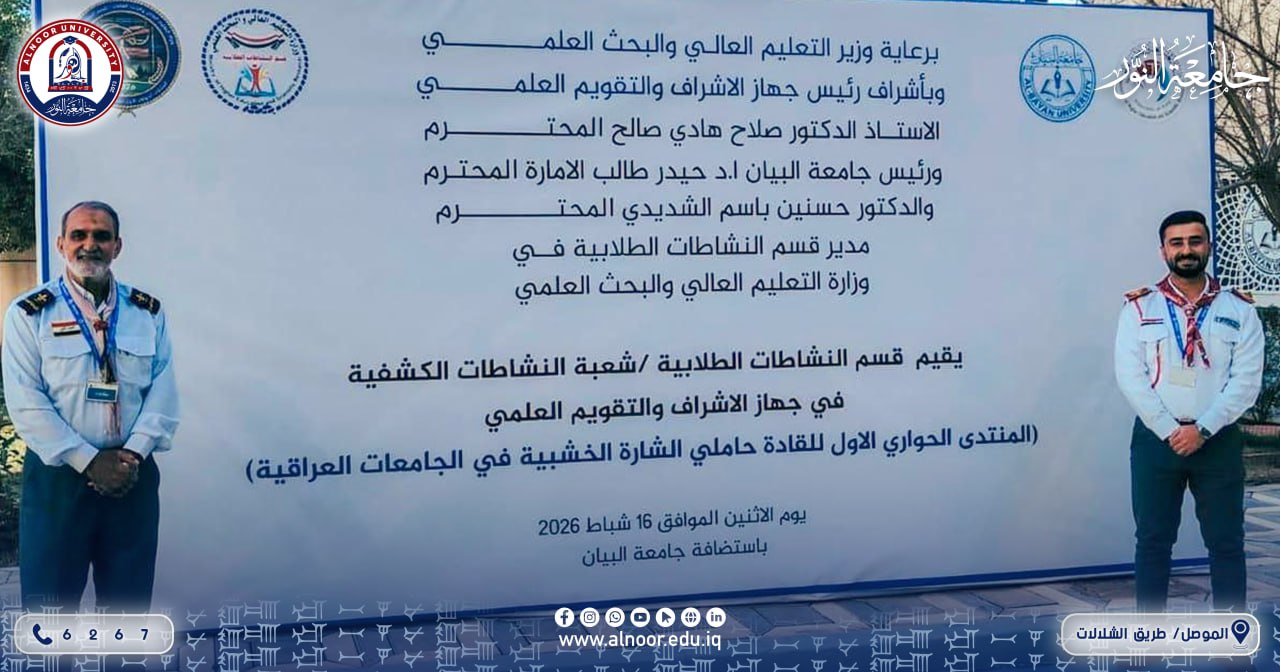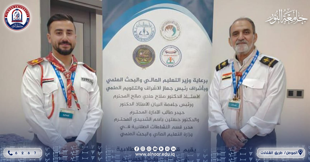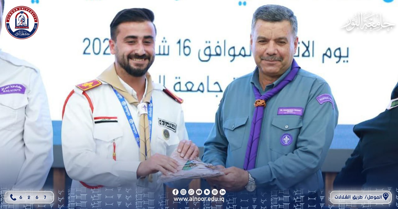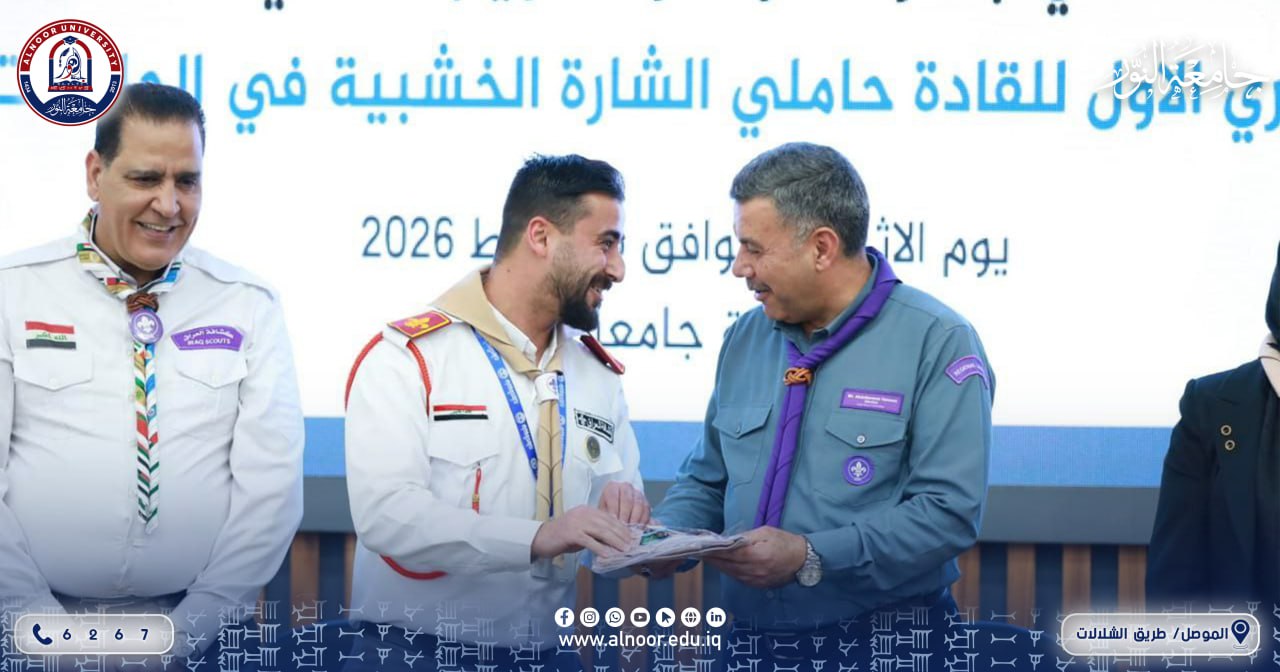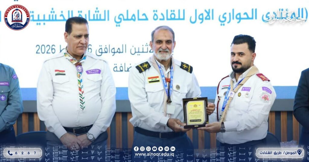 ضمن مشاركة جامعة النور في “المنتدى الحواري الأول للقادة حاملي الشارة الخشبية” المقام في جامعة البيان، حظي ممثلو جامعة النور بتكريم رفيع المستوى تقديراً لجهودهم في تعزيز الحركة الكشفية، حيث سلّم القائد عبد الكريم حنون المفوض الدولي للكشافة العراقية وعضو اللجنة الكشفية العربية درع تقديري للمدرس الدكتور زياد خضر اسماعيل، كما وشّح المدرس المساعد مصطفى محمد جميل بمنديل الشارة الخشبية مع شهادة تقديرية.