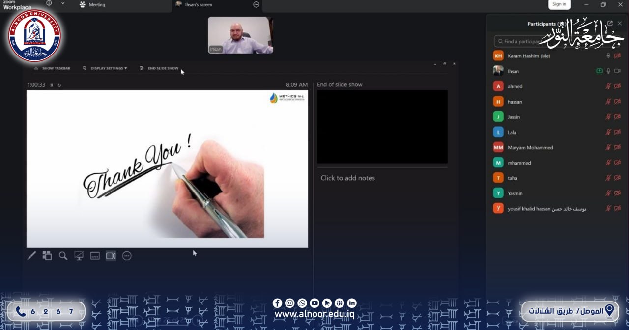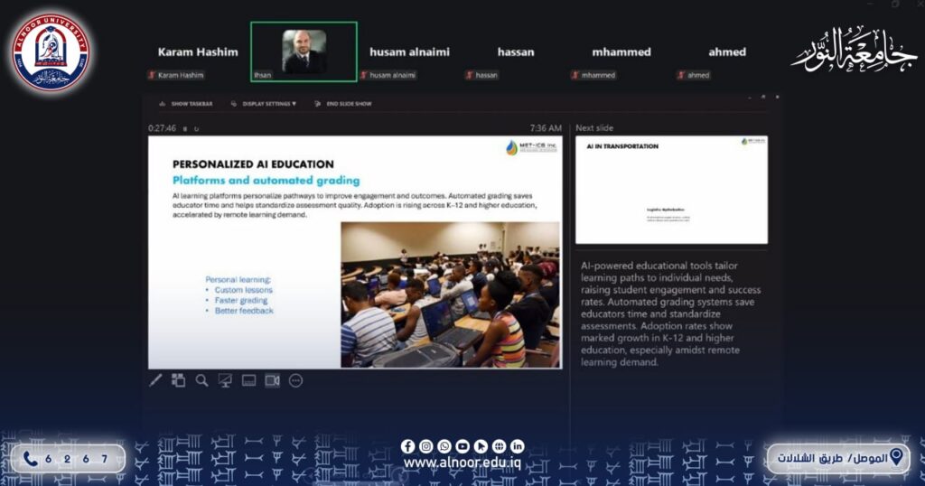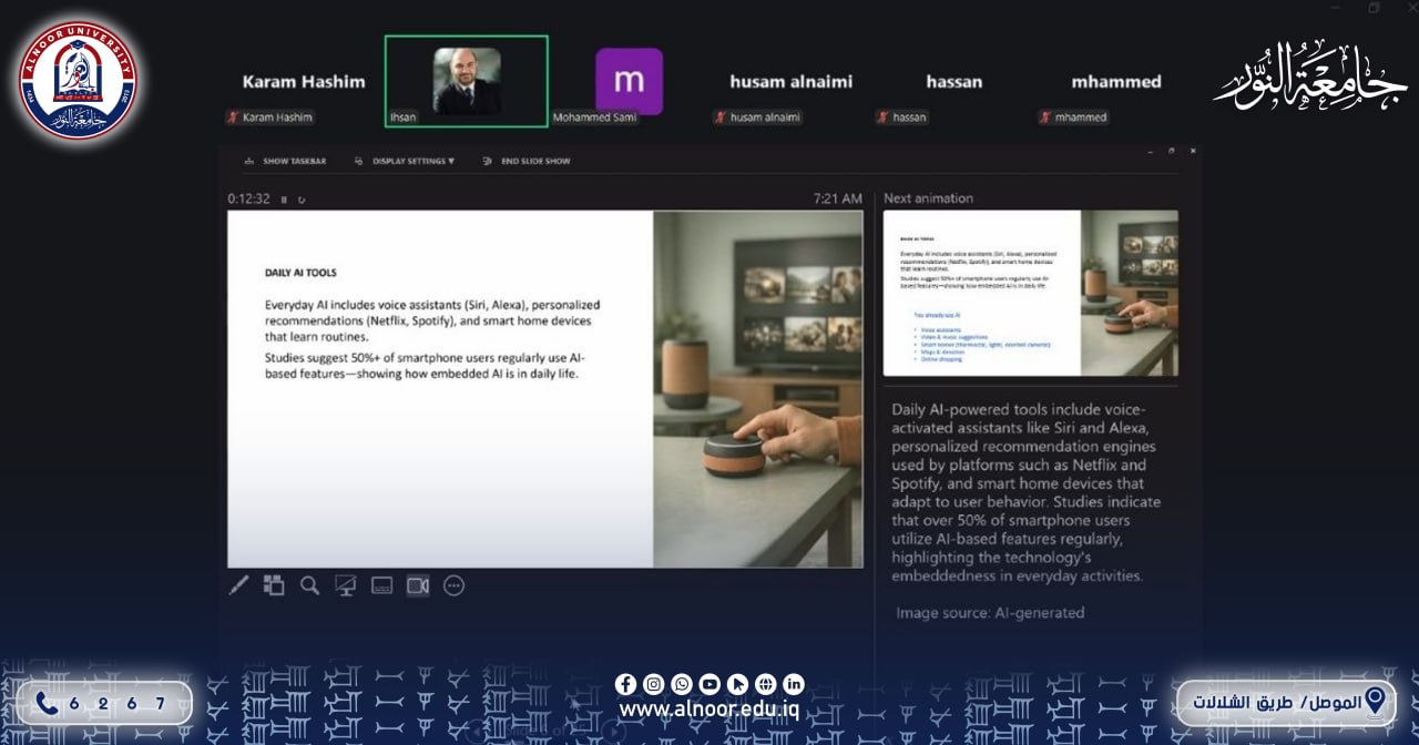 اختتمت جامعة النور الاثنين الموافق 2026/3/30 فعالية أكاديمية متميزة استضافت خلالها الدكتور إحسان الطائي، الخبير البارز في علوم المواد وإدارة الابتكار، والذي يمتلك خبرة تمتد لأكثر من 35 عاماً في قطاعي الطاقة والبحث العلمي.وهو حاصل على شهادة الدكتوراه من جامعة مانشستر عام 1992، قدم خلال الفعالية محاضرة علمية بعنوان “الذكاء الاصطناعي في الحياة اليومية: تطبيقات عبر القطاعات” (AI in Everyday Life: Applications Across Sectors)، استعرض فيها كيفية توظيف تقنيات الذكاء الاصطناعي كحلول عملية مبتكرة تسهم في إحداث نقلة نوعية وتطوير العمليات اليومية في مختلف القطاعات الحيوية..وتأتي هذه الاستضافة ضمن جهود الجامعة الرامية للارتقاء بالبيئة البحثية، وإطلاع الطلبة والأكاديميين على أحدث المستجدات التكنولوجية من خلال مد جسور التواصل مع الكفاءات العلمية العالمية.