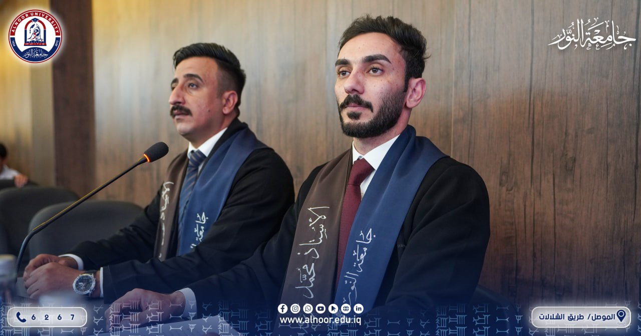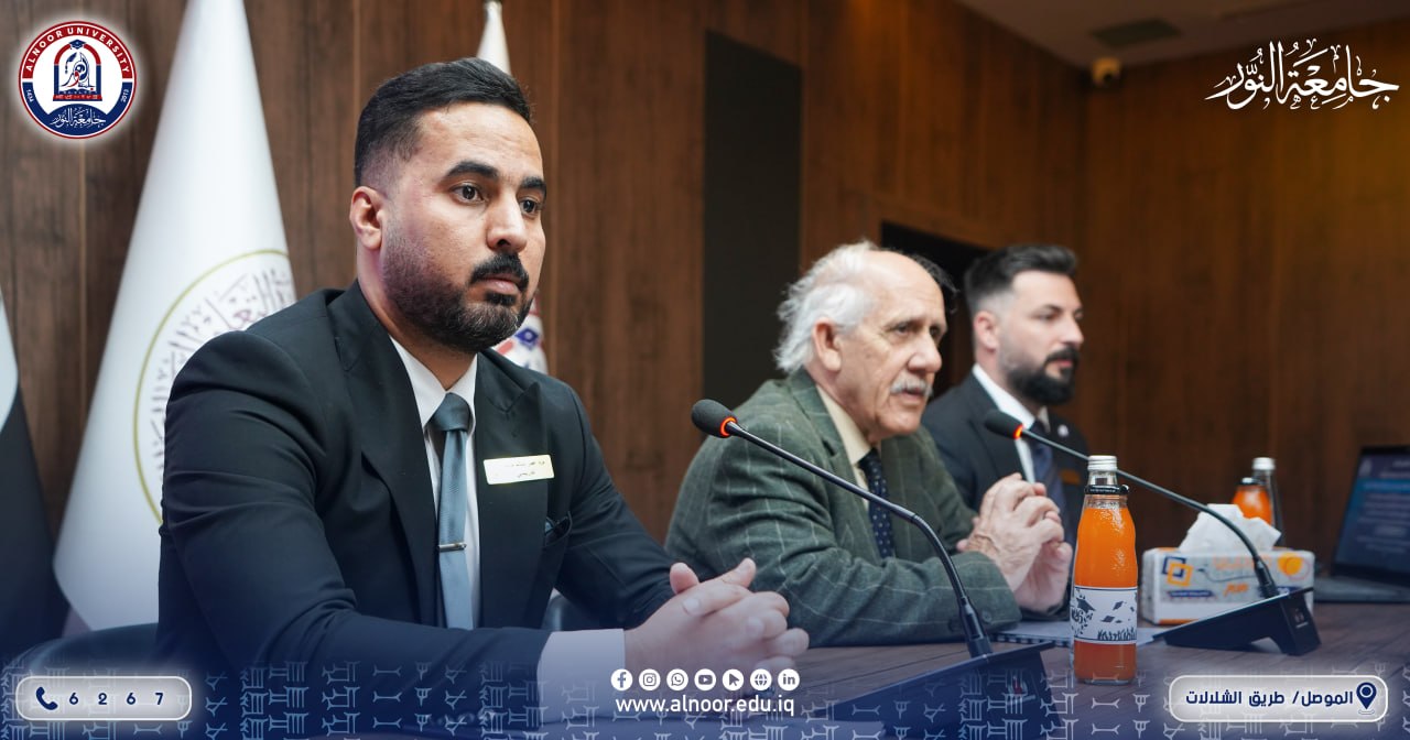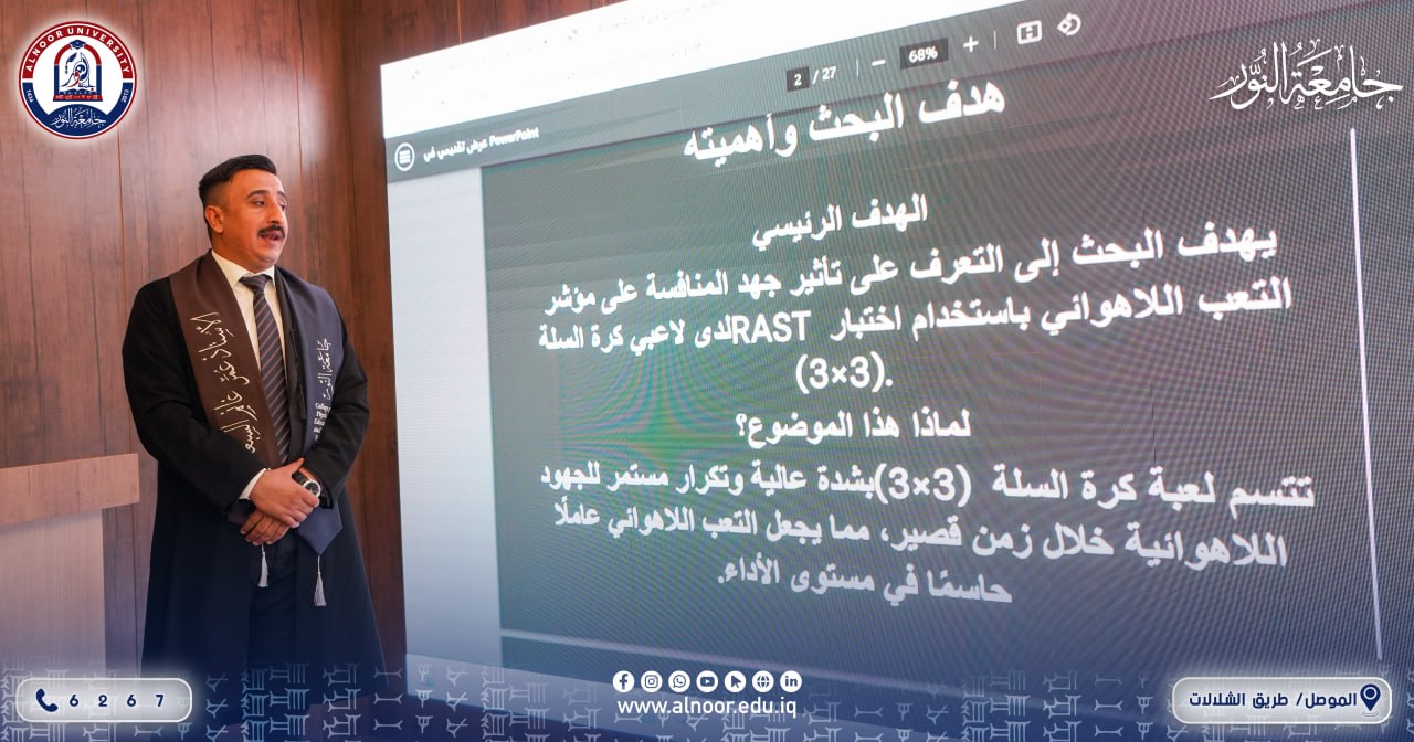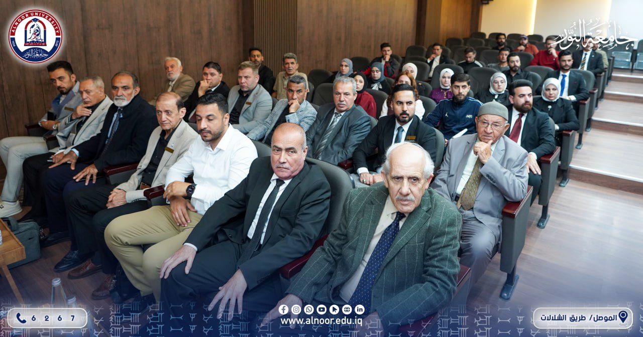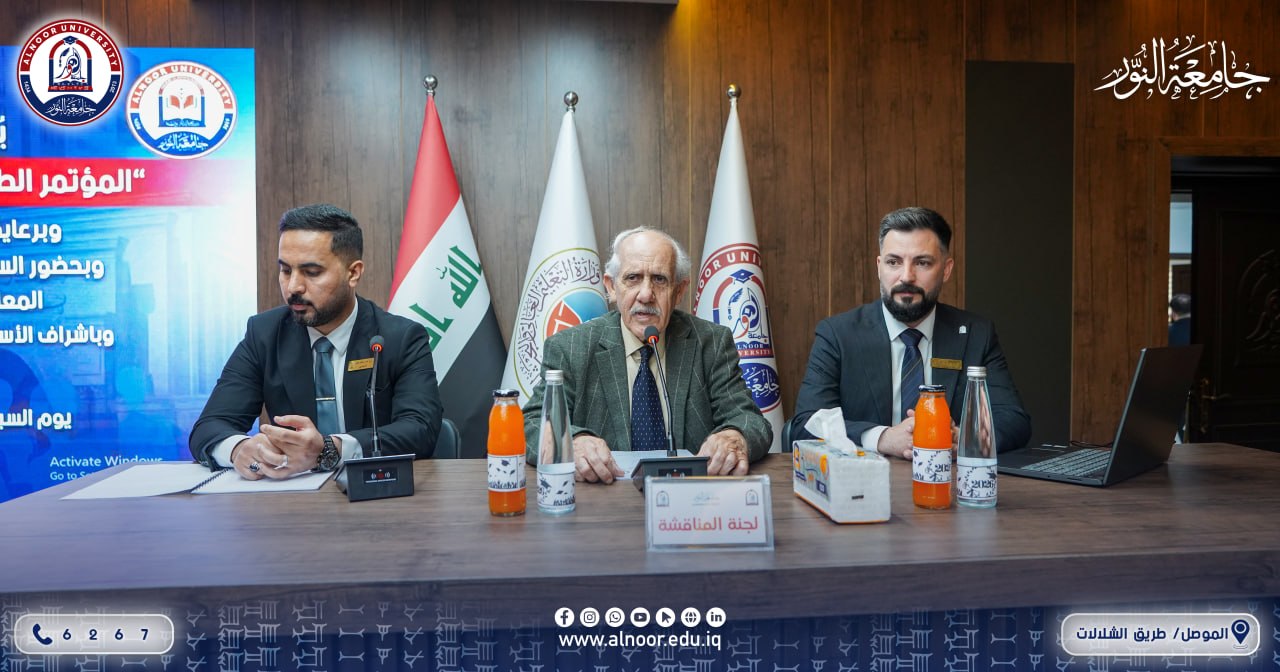 بحضور الاستاذ الدكتور ياسين طه الحجار رئيس جامعة النور والاستاذ الدكتور خزعل فتحي زيدان عميد كلية التربية وبإشراف الاستاذ الدكتور ناظم الوتار رئيس قسم التربية البدنية وعلوم الرياضة أقام قسم التربية البدنية وعلوم الرياضة في كلية التربية في الجامعة صباح يوم السبت الموافق 2026/4/25 المؤتمر السنوي الرابع لبحوث تخرج طلبة المرحلة الرابعة،تحت شعار العلم والبناء،استهل المؤتمر بكلمات لرئيس الجامعة وعميد كلية التربية ورئيس قسم التربية البدنية وعلوم الرياضة،ثم جرى عرض بحوث التخرج من قبل مجاميع الطلبة ومناقشتها من قبل لجان متخصصة من تدريسيي القسم.