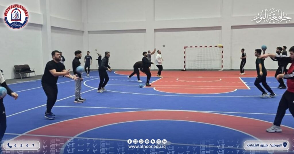 داخل القاعة الرياضية المغلقة في جامعة النور، تتواصل المحاضرات التطبيقية لطلبة قسم التربية البدنية وعلوم الرياضة، في أجواء حيوية تعكس