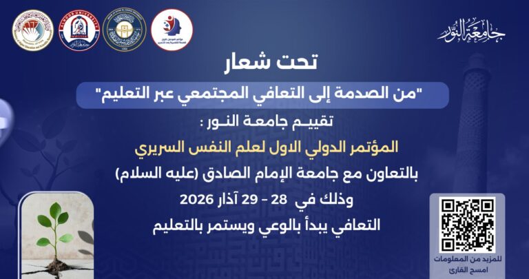University News جامعتا النور والإمام جعفر الصادق( عليه السلام )تتعاونان في إقامة المؤتمر الدولي الأول لعلم النفس السريري تقيم جامعة النور بالتعاون مع جامعة الإمام جعفر الصادق( عليه المزيد عن الخبر لا توجد تعليقات
