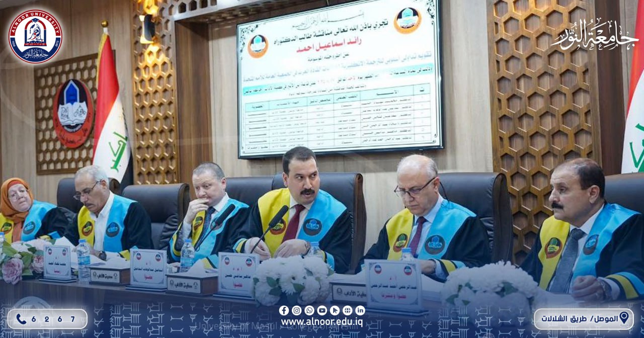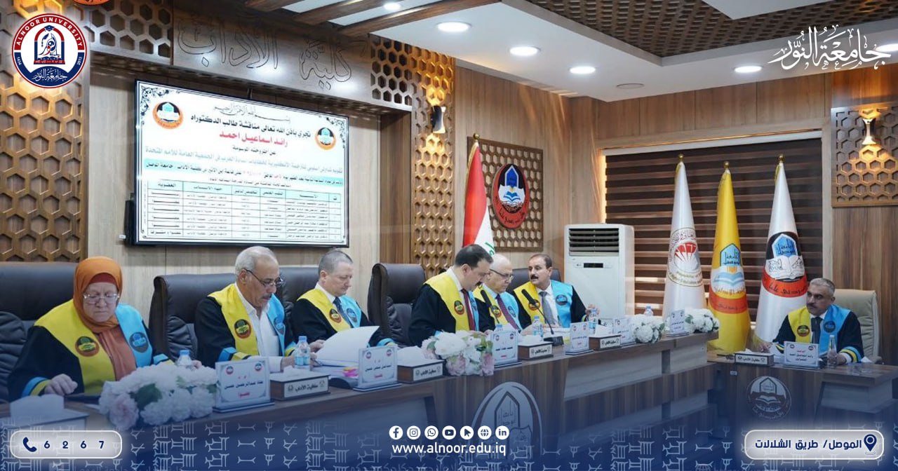 Assistant Professor Dr. Ismail Abdulwahhab Ismail, On Sunday, 17 August 2025, the Assistant President of Alnoor University for Scientific Affairs participated in the defense committee of PhD student Raed Ismail Ahmed for his dissertation submitted to the Department of Translation, College of Arts, University of Mosul, under the title:
