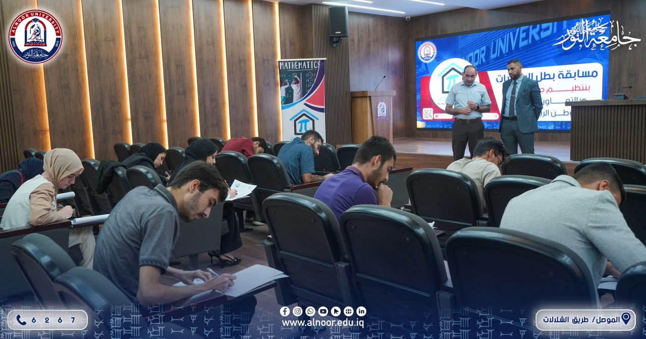 Under the patronage of Alnoor University and in cooperation with the Mathematics Homeland team, the competition test for the (Mathematics Champion in Integration) was launched today at Alnoor University, with the participation of a number of students from the universities of Nineveh This competition aims to develop students' skills in the field of mathematics, promote a spirit of scientific competition and intellectual creativity among them, and contribute to supporting young talents and showcasing their potential in the field of science.