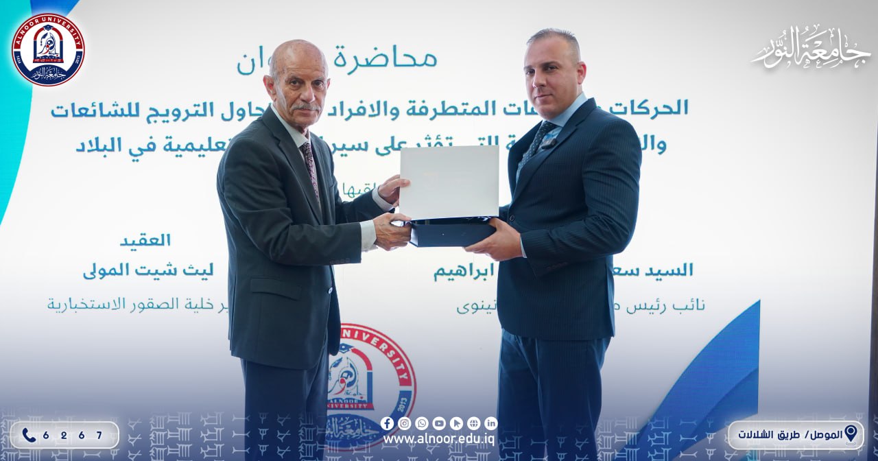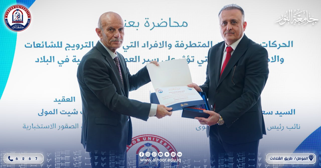 In the presence of Prof. Dr. Yaseen Taha Alhajjar, The President of Alnoor University and Dr. Bashar Mahmoud Ali, Chairman of the University Board of Trustees, organized College of Law and Political Science On Tuesday, 18/11/2025, an awareness-raising educational session titled Extremist Movements and Groups was supervised by Assistant Professor Dr. Faris Ahmed Ismael The lecturer at the college, and I delivered three lectures there