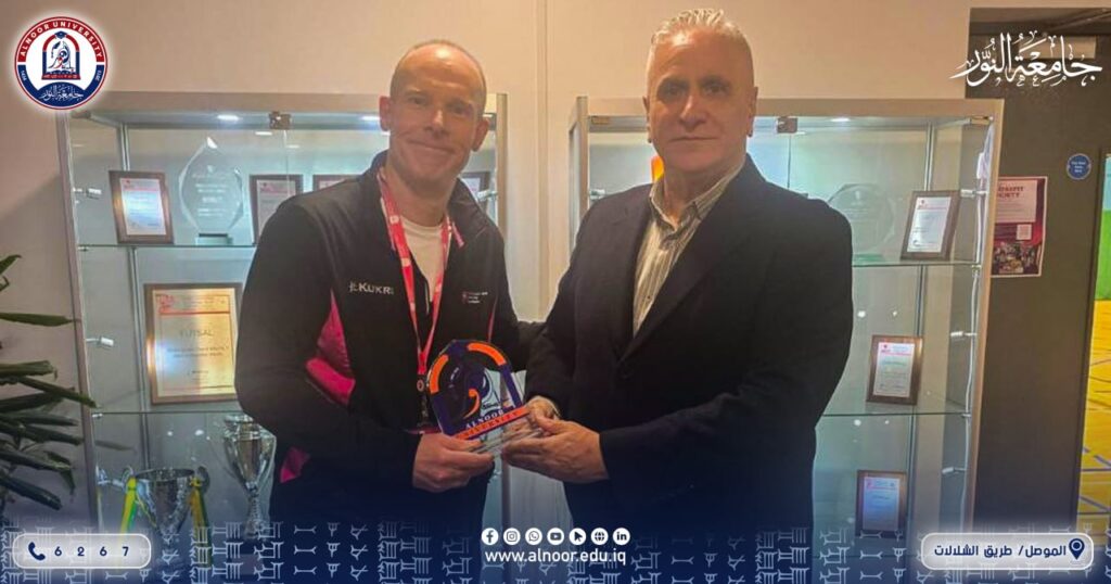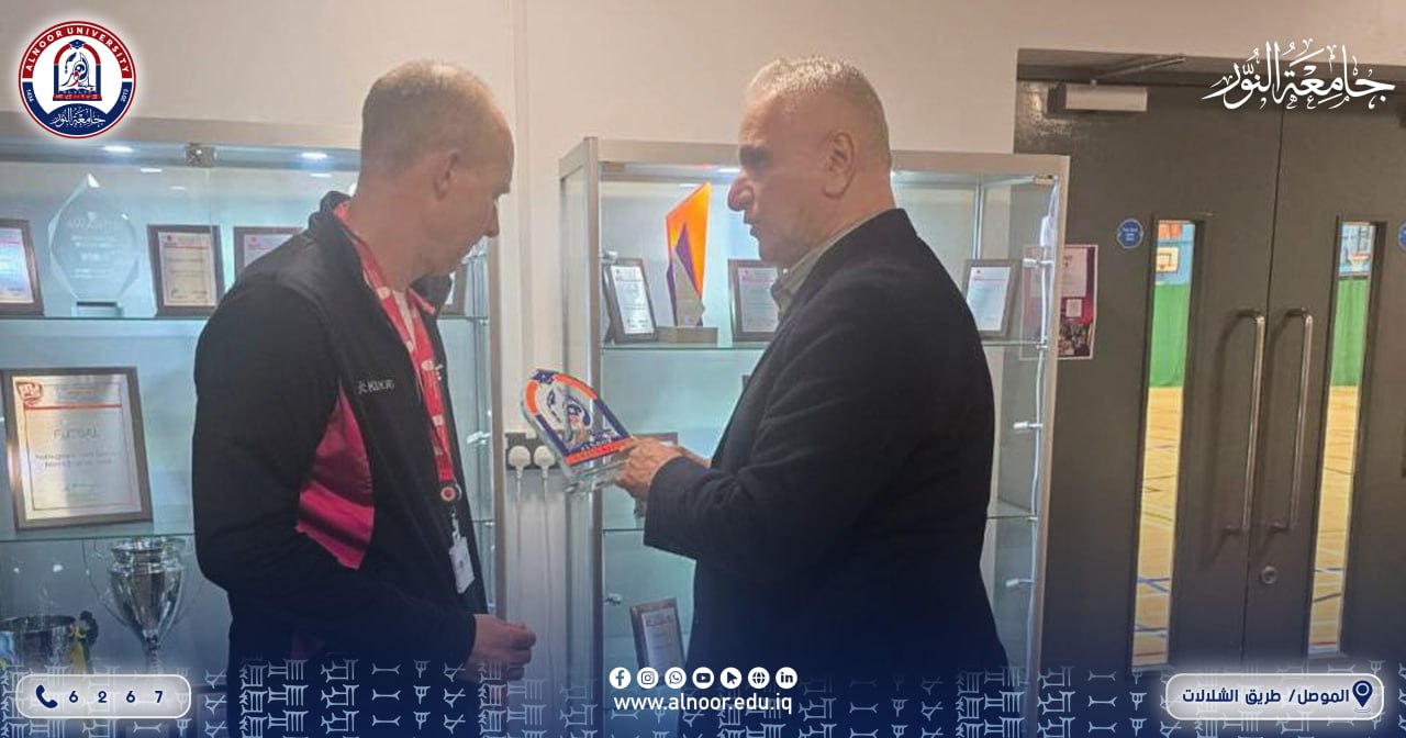 Professor Dr. Nazem Shaker Alwattar, Head of the Department of Physical Education and Sports Sciences, met with College of Education . At Alnoor University, with Professor Chris Harwood, Director of the Sport, Health, and Performance Enhancement (SHAPE) Research Centre at Nottingham Trent University, UK, within the framework of promoting international academic collaboration and developing research partnerships for the Department of Physical Education and Sports Science.
