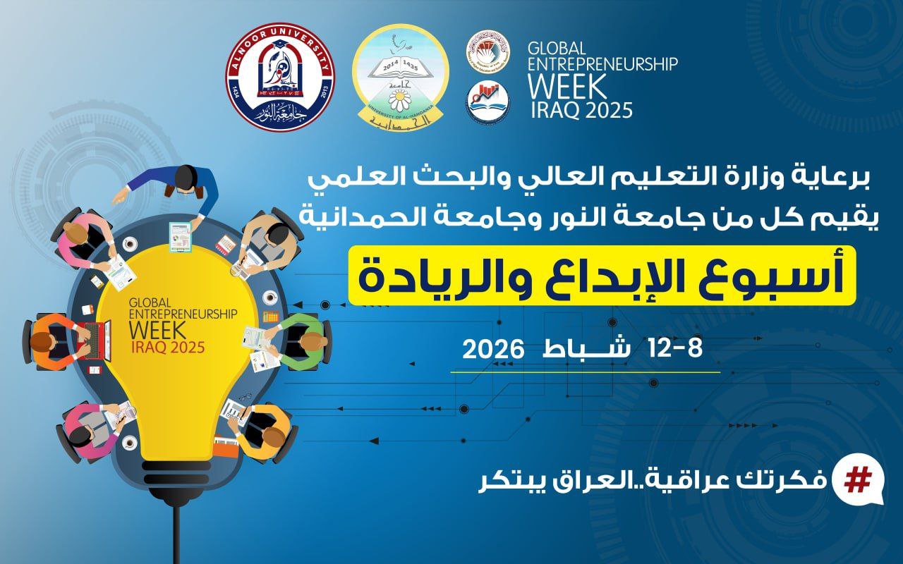 Under the patronage of the Ministry of Higher Education and Scientific Research, and in the presence of the Presidents of Alnoor University and Alhamdaniya University, Alnoor University and Alhamdaniya University are organizing the Week of Creativity and Entrepreneurship, to be held from 8 to 12 February 2026 at Alnoor University, under the slogan: