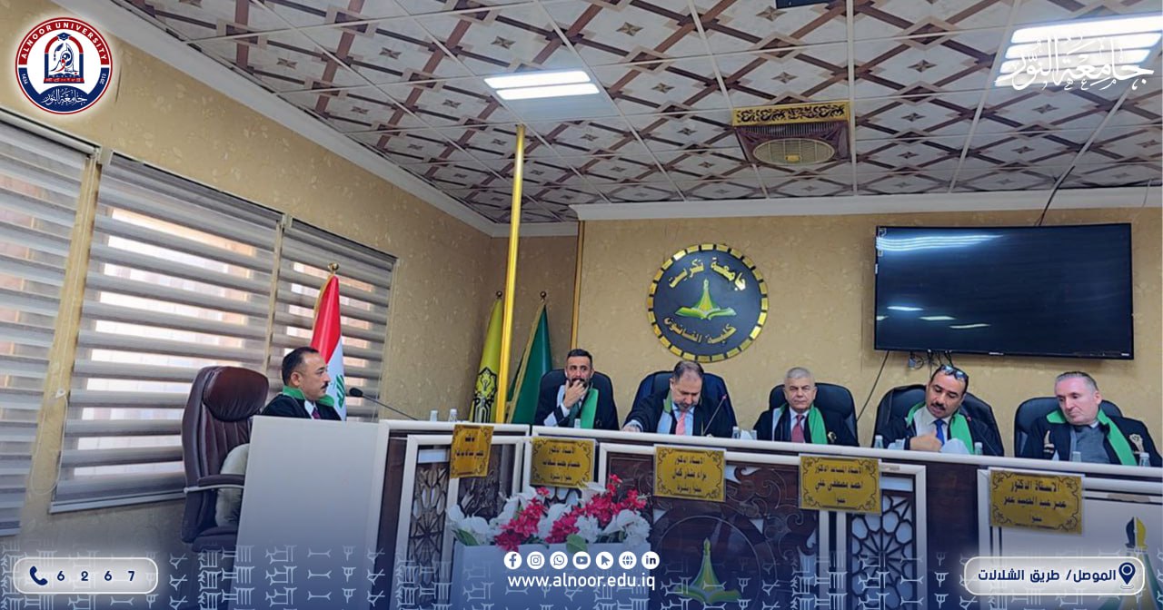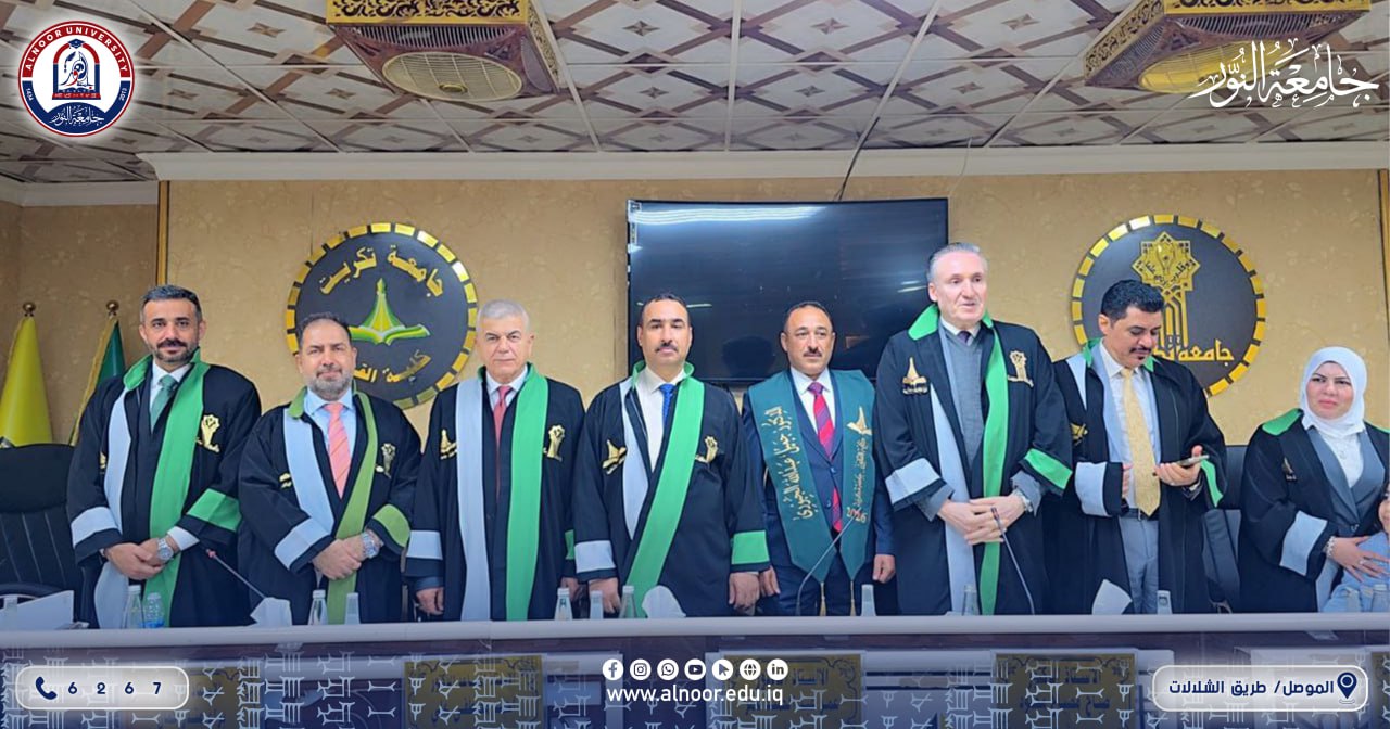 The Dean of the College of Law and Political Science at Alnoor University participates in the discussion of a PhD dissertation for a student at Tikrit University
