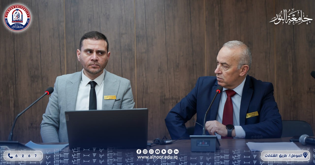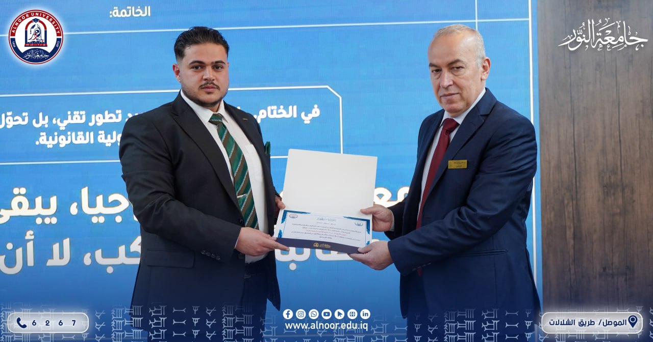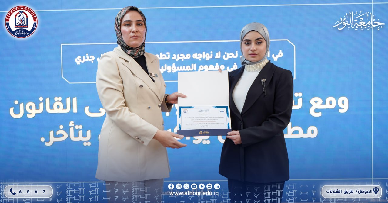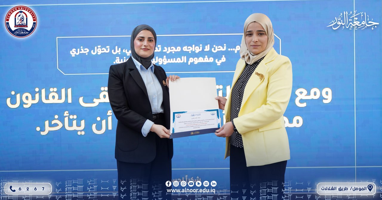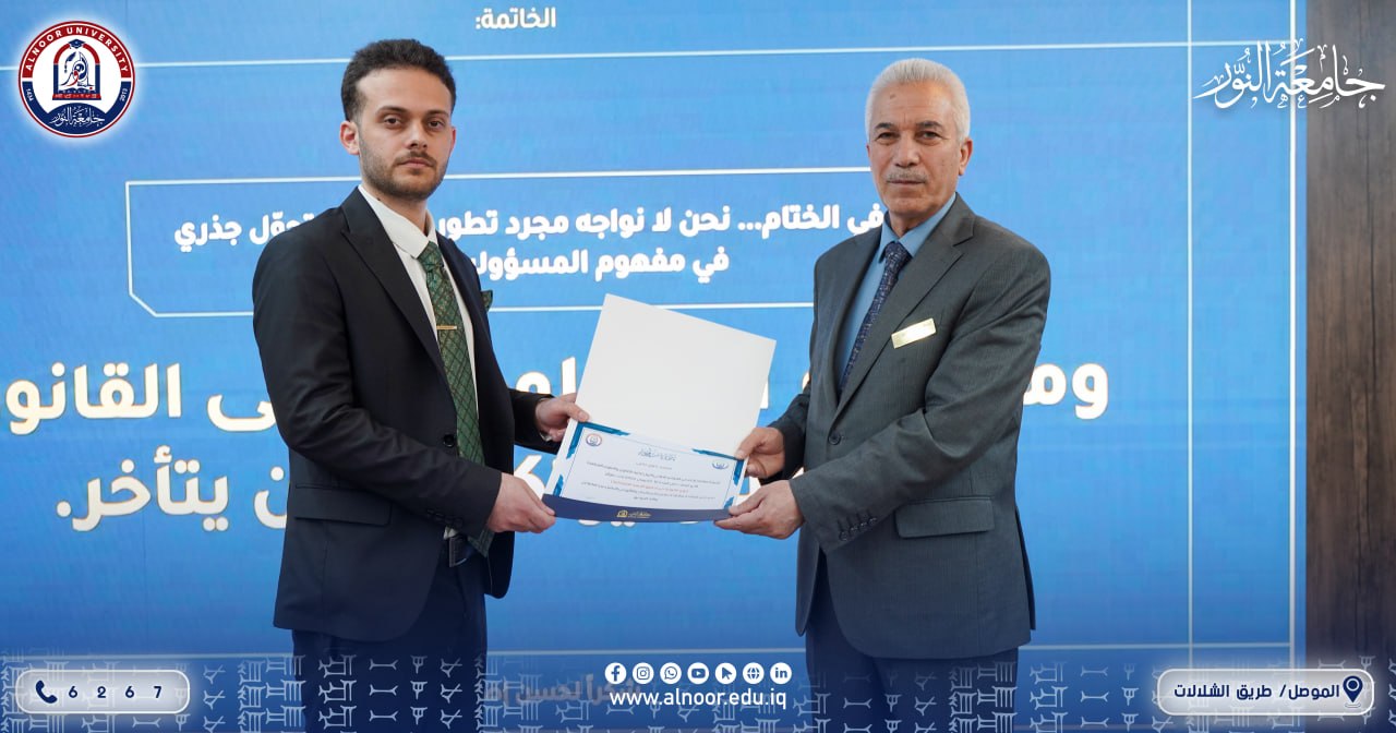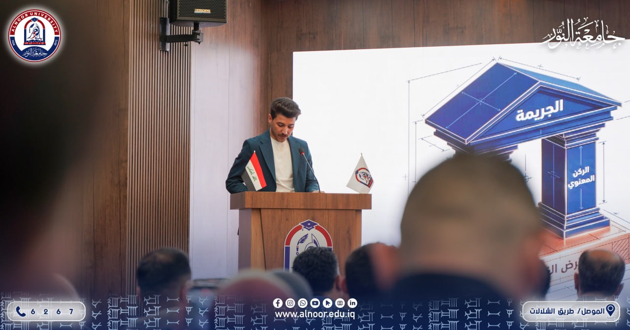 The proceedings of the first student conference organized by College of Law and Political Science At Alnoor University, on its second day, Monday corresponding to 13/4/2026, five graduation research papers were presented by five groups of college students. The papers addressed various legal and political topics, reflecting a distinguished academic level and serious research efforts.