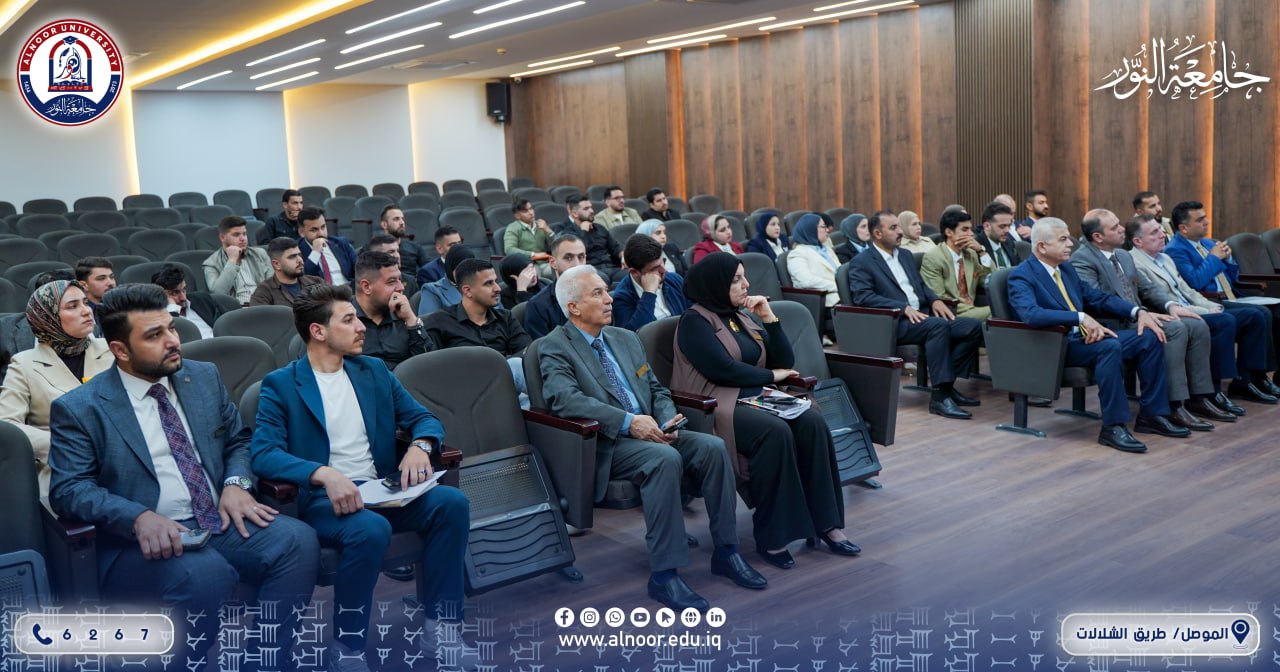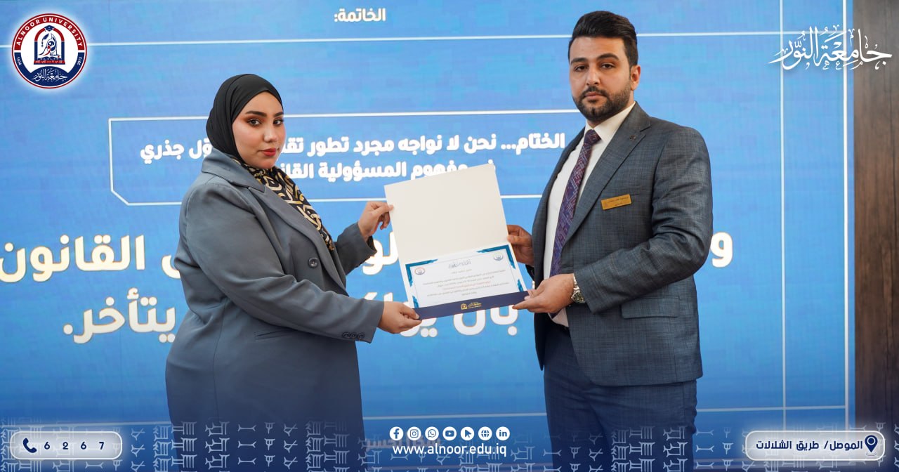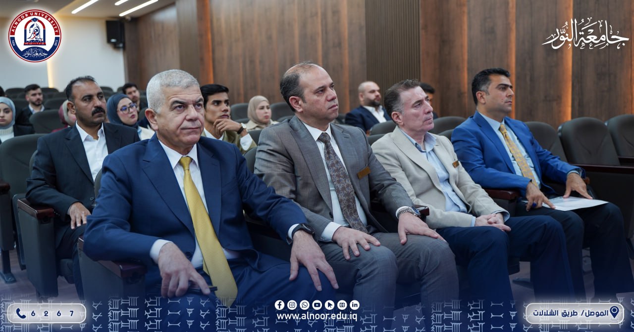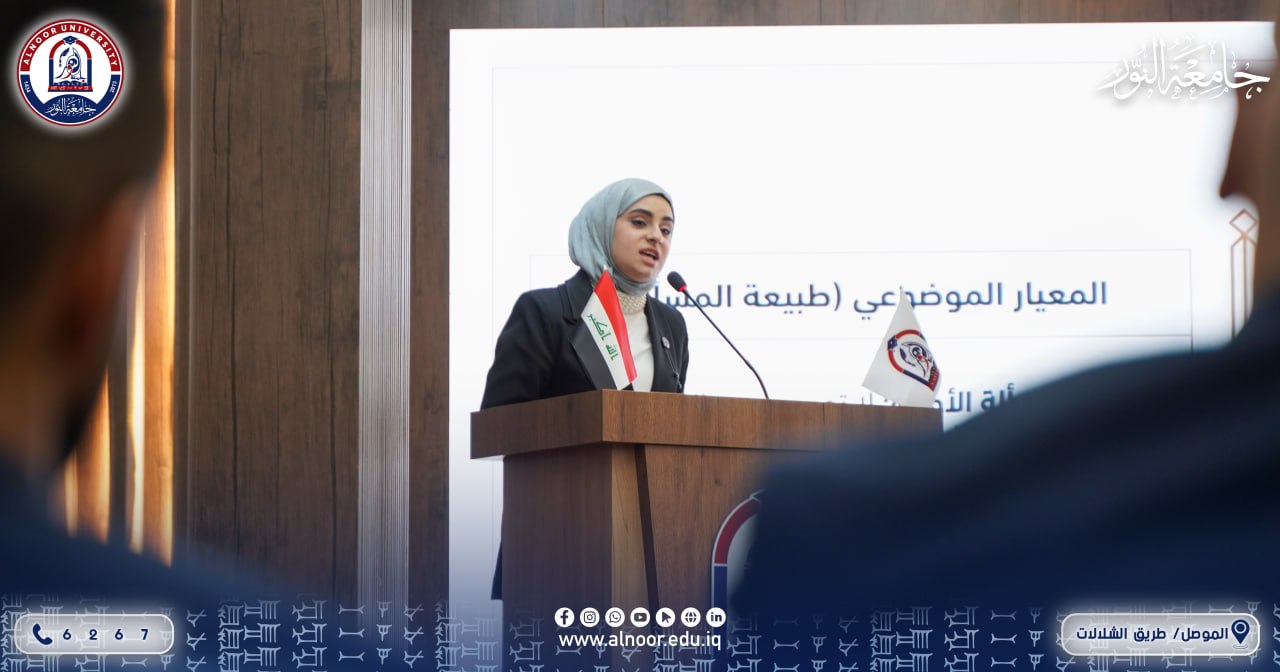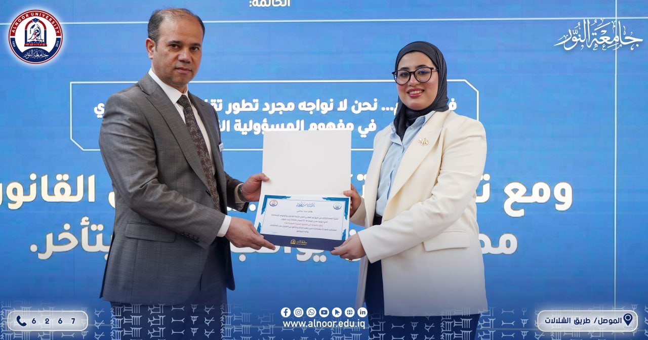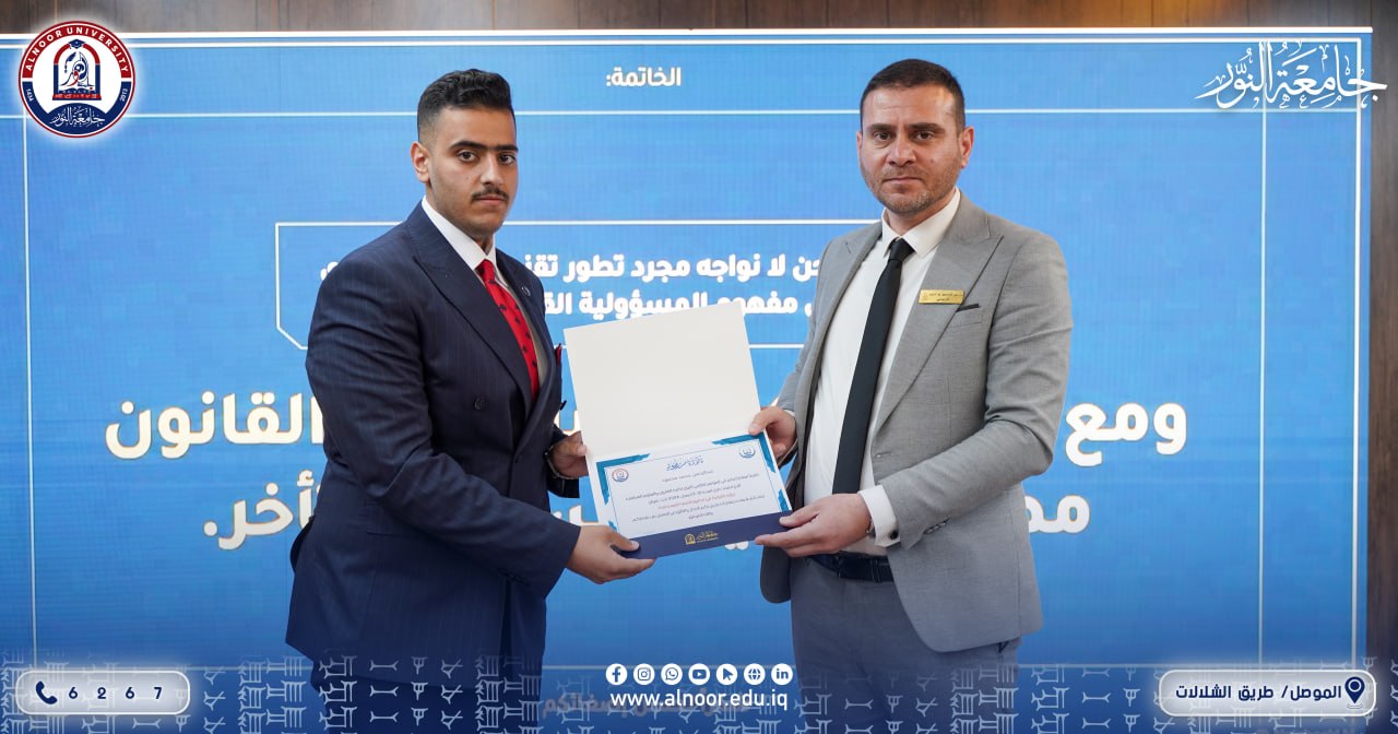 The proceedings of the first student conference organized by College of Law and Political Science At Alnoor University, on its second day, Monday corresponding to 13/4/2026, five graduation research papers were presented by five groups of college students. The papers addressed various legal and political topics, reflecting a distinguished academic level and serious research efforts.
