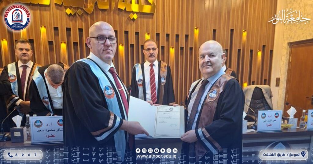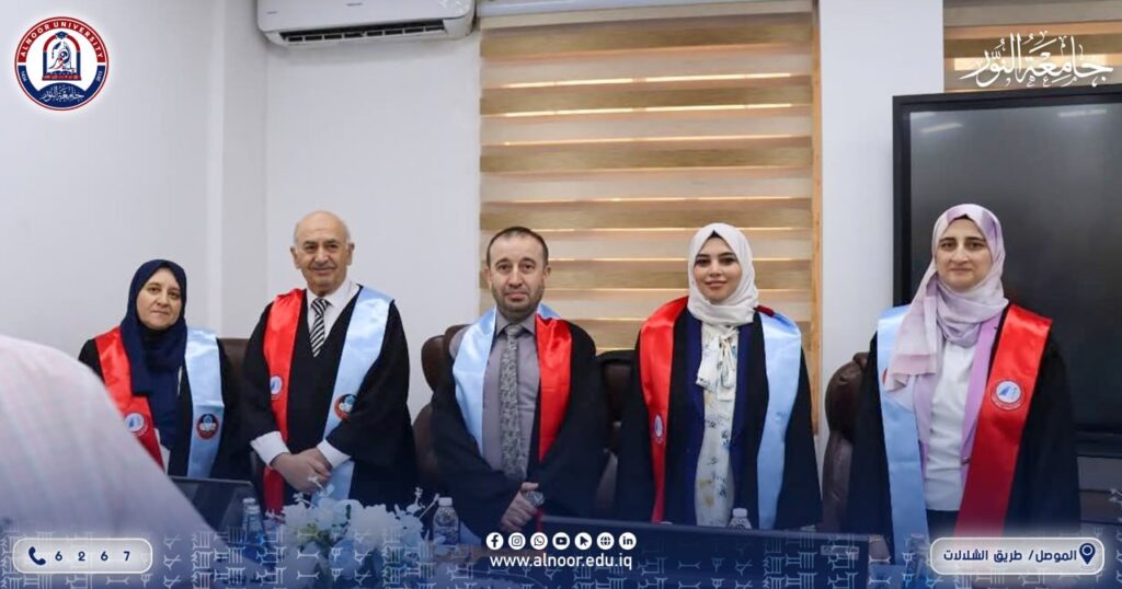 ترأس الاستاذ احمد يحيى دلال باشي التدريسي في كلية الصيدلة بجامعة النور صباح يوم الثلاثاء الموافق 2025/8/19 لجنة مناقشة طالبة